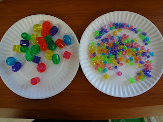 I used Jumbo Fancy Glitter Beads and Jumbo Translucent Beads from Discount School Supply.  But you could easily use Pony Beads or any other bead that would fit over your pipe cleaners.  The Jumbo Translucent Beads are really big, and were too heavy for a single pipe cleaner frame to support when we were done beading and ready to display our finished products.  But that is easily remedied and addressed in the 'Finishing' section.  They were by far the most popular beads, however, especially with the younger kids.