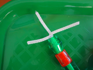 Use 3 pipe cleaners to make each snowflake frame.  First, I wrapped two pipe cleaners together at their centers to make a cross.  Then I wrapped one more pipe cleaner at the center to make a 6-stem asterisk shape for the snowflake frame.