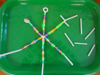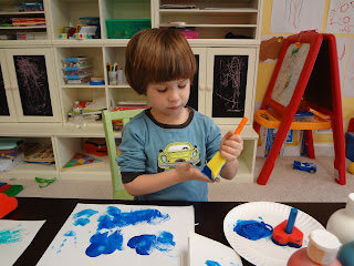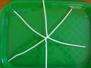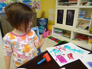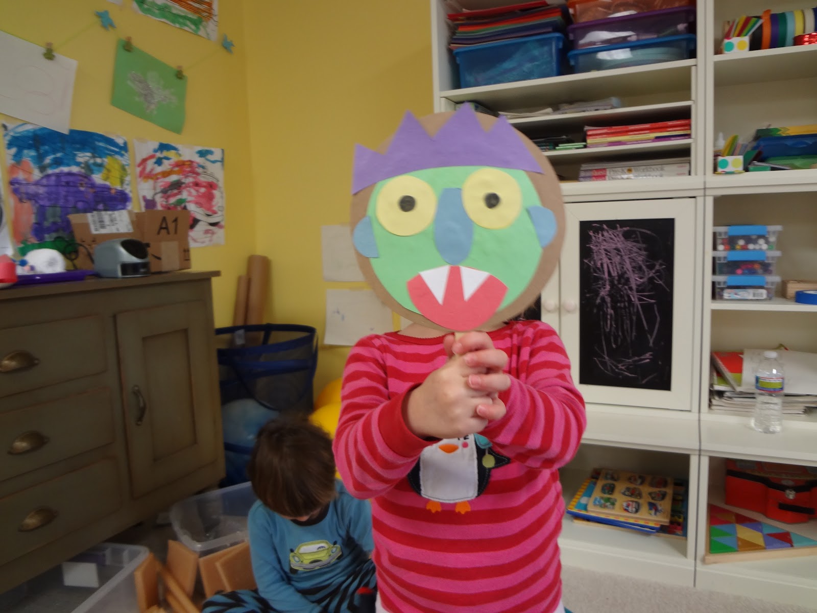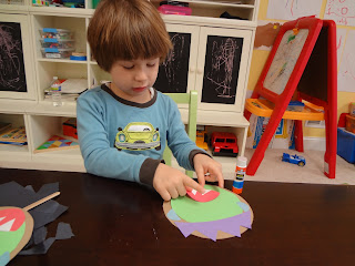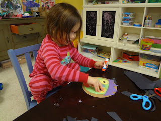 Around the time my kids turned 3, they developed some new fears, including a fear of monsters. One strategy we came up with to help them was to make up a little story about a monster coming to our house and being scared away by our ferocious kitty cats. They still tell each other that story, six months later. We also read some books about monsters. Our hands down favorite was Go Away Big Green Monster by Ed Emberley. Months ago, I cut out the pieces needed for this project. But as soon as I was ready, their interest in the book waned a bit, and so I put it aside. We've recently had a revival of interest in the book - they've been reading it to their cars. I thought the time might be right to do this project. I chose to match the description of the monster in Ed Emberly's book, but of course, you can use any color, shape for the monster face features that you like.