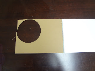 Cut out monster features: face, eyes, ears, nose, mouth, etc from construction paper. Cut out a circle large enough for your monster face from thin cardboard. I used the back of a pad of paper that we were done with.