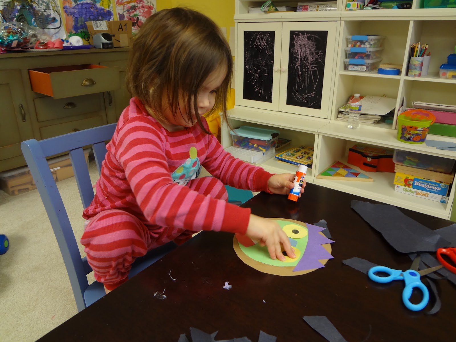 I got out the glue sticks, face pieces, and cardboard background and we got to it. My kids enjoyed picking the feature to do next and also enjoyed the tie-in to the story.